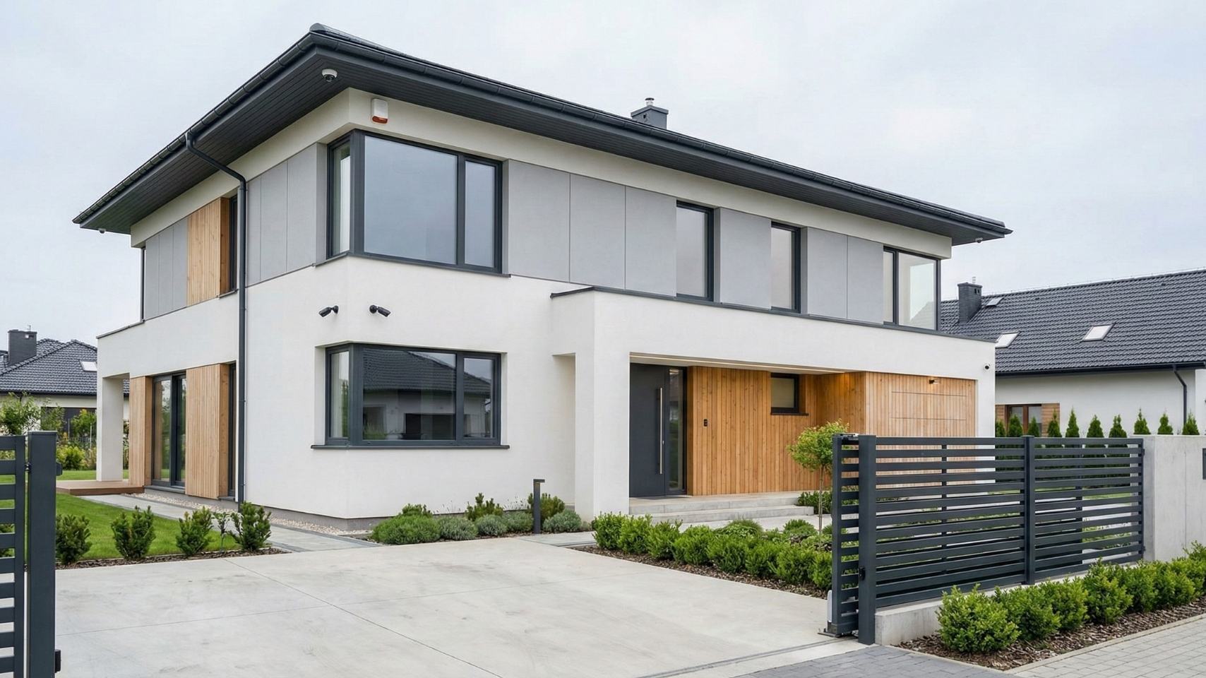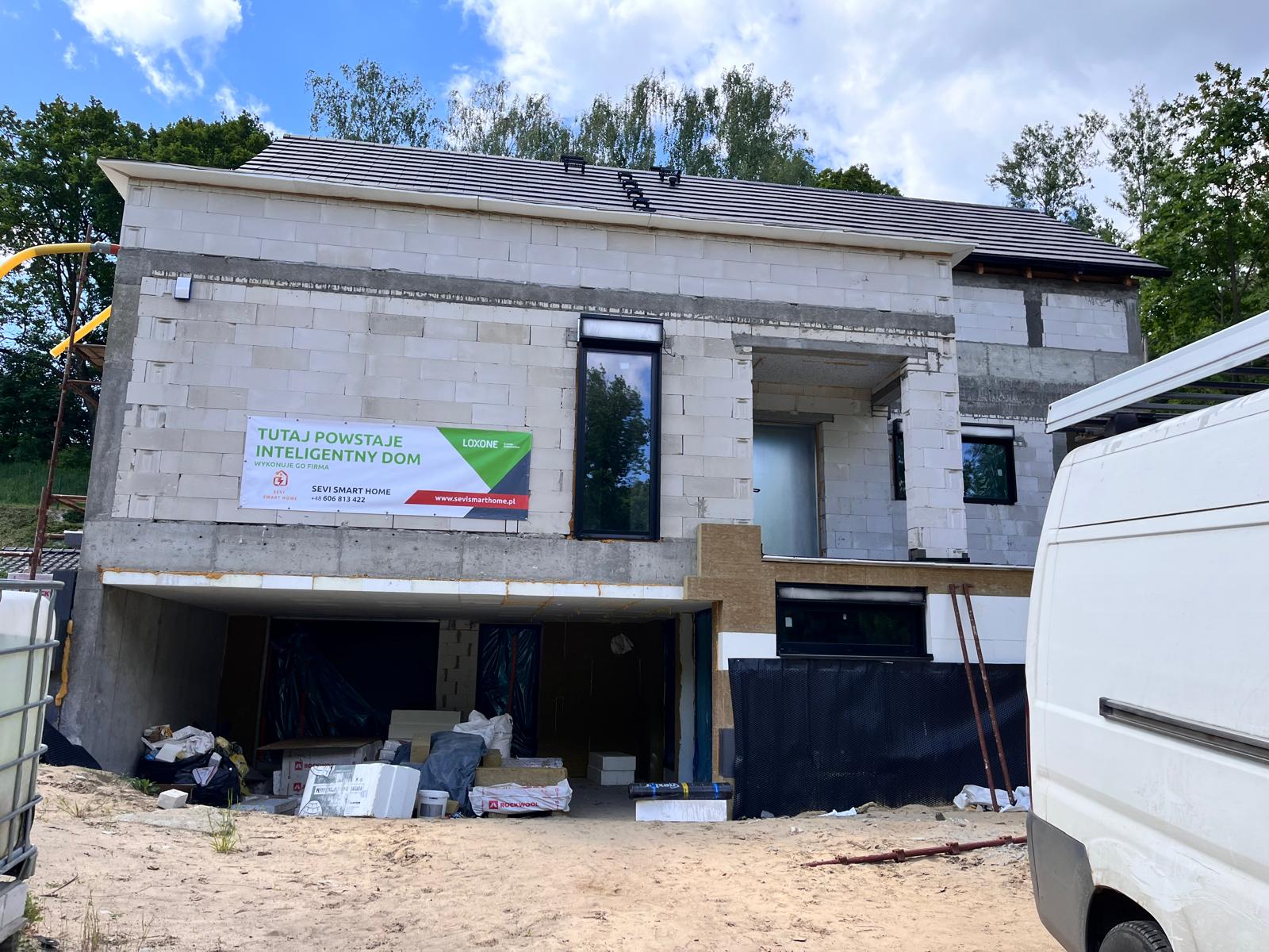 Duży, nowoczesny dom jednorodzinny, w którym realizujemy instalację systemu smart home. Projekt obejmuje kompleksową automatyzację. Aktualnie inwestycja jest w toku – zakończono wstępne etapy prac, a kolejne elementy zostaną wdrożone po postępie prac wykończeniowych.