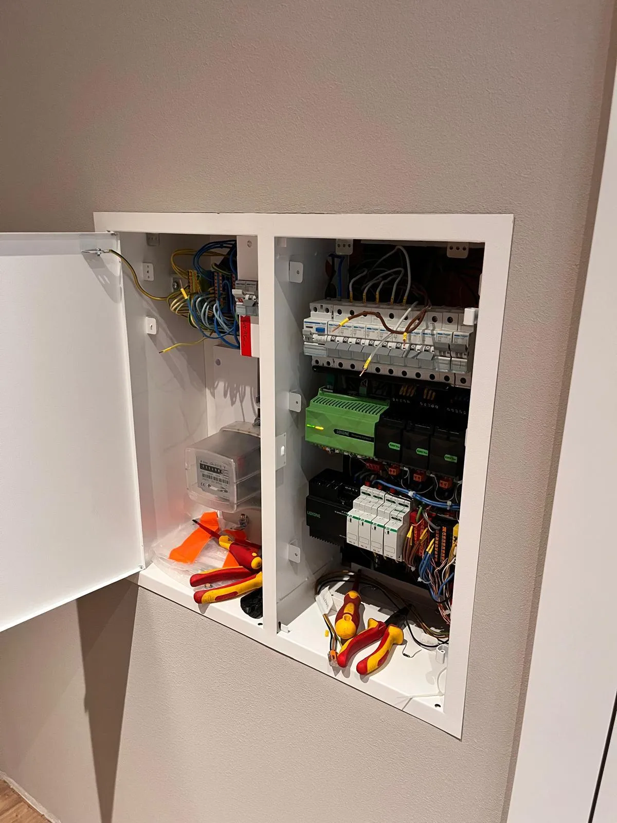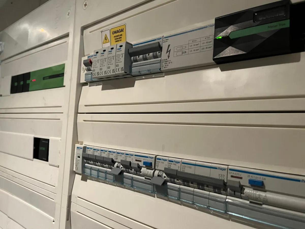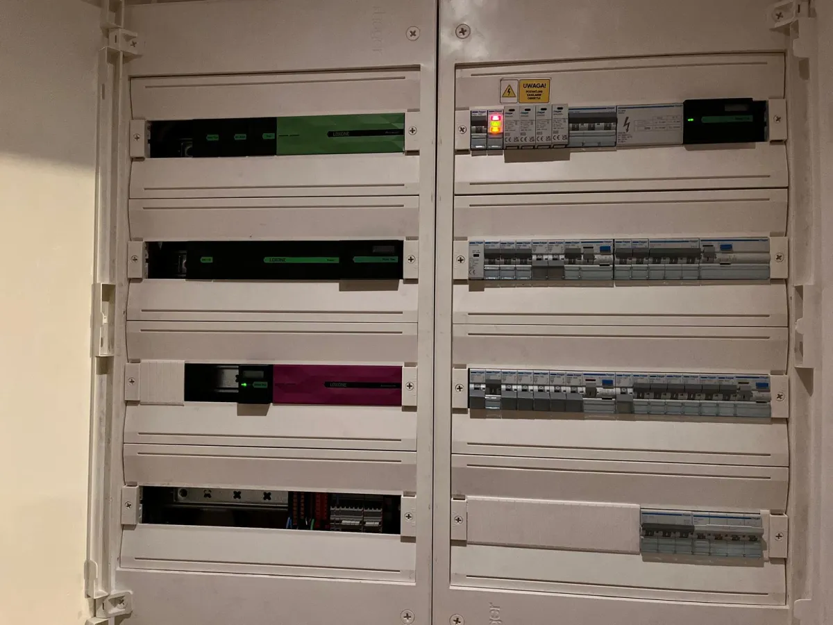 W zmodernizowanym domu wykonaliśmy kompleksową automatyzację kluczowych instalacji. System steruje oświetleniem wewnętrznym, roletami, ogrzewaniem oraz nagłośnieniem audio, a także podlewaniem ogrodu. Zastosowaliśmy oświetlenie magistralne DALI, które zapewnia precyzyjne i elastyczne zarządzanie światłem w całym obiekcie. Całość uzupełnia system alarmowy zwiększający bezpieczeństwo mieszkańców. Dokumentacja fotograficzna obejmuje obecnie głównie rozdzielnicę, jednak instalacja obejmuje znacznie szerszy zakres prac, widoczny na miejscu realizacji.