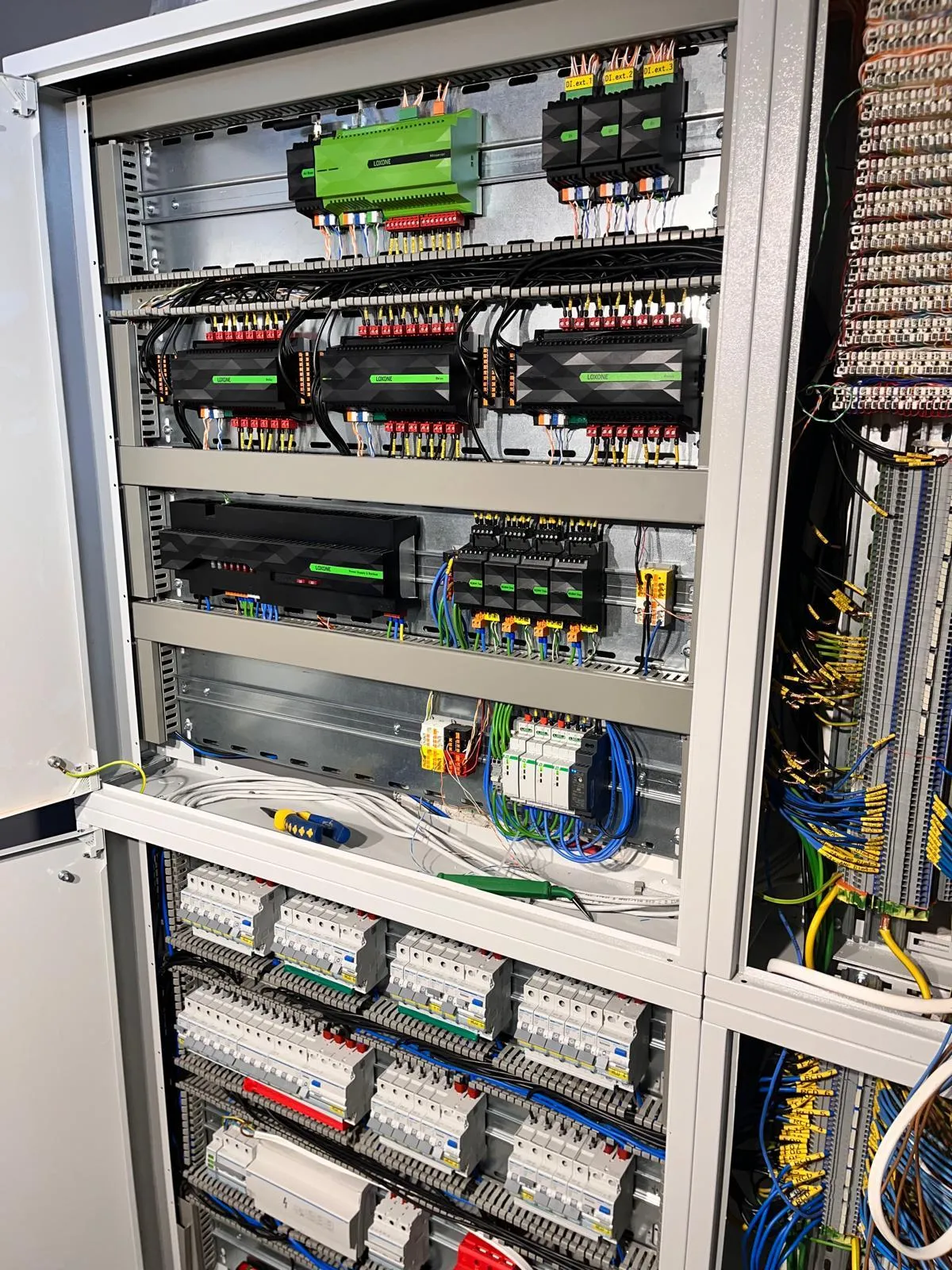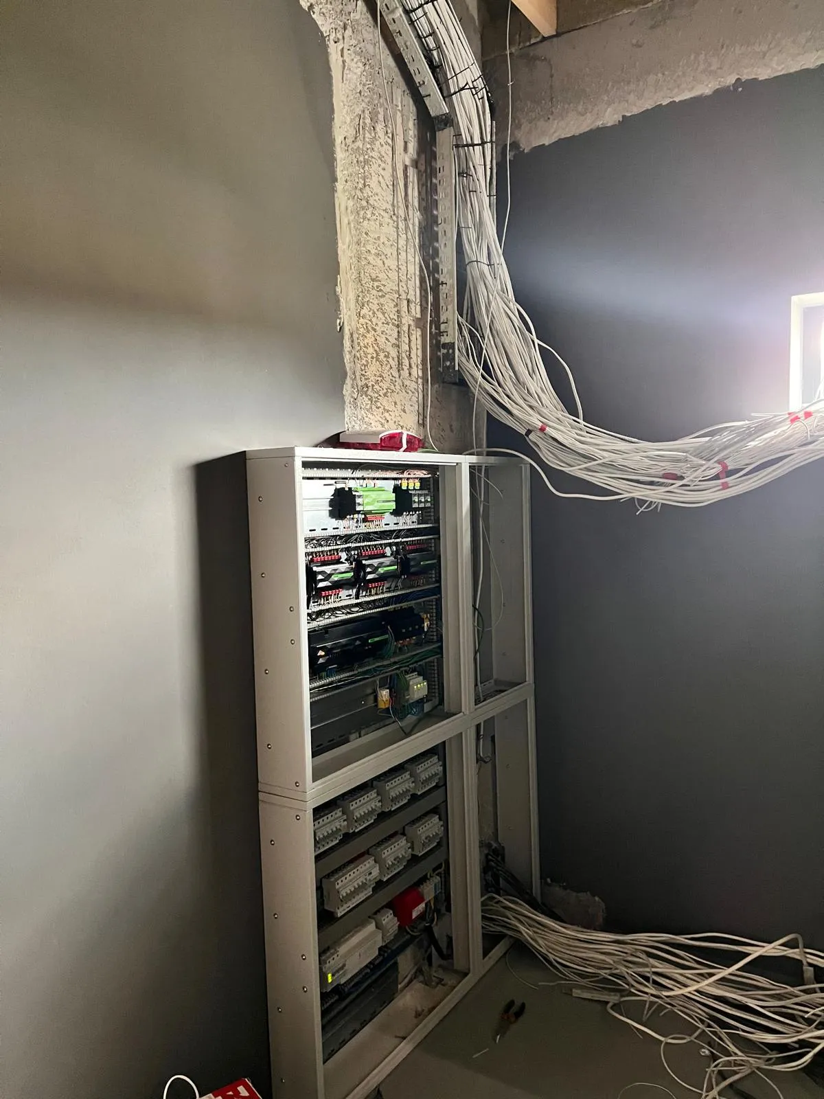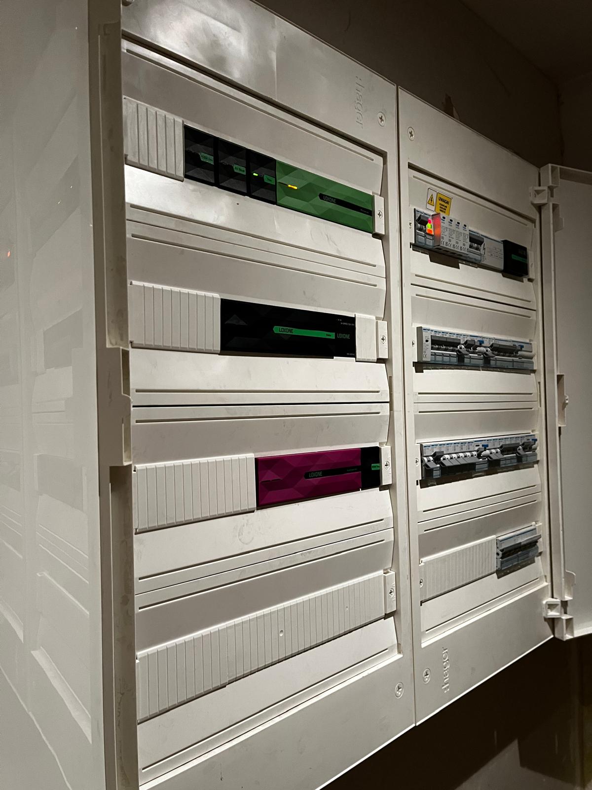 W zmodernizowanym domu wykonaliśmy kompleksową automatyzację kluczowych instalacji. System steruje oświetleniem wewnętrznym, roletami, ogrzewaniem oraz nagłośnieniem audio, a także podlewaniem ogrodu. Zastosowaliśmy oświetlenie magistralne DALI, które zapewnia precyzyjne i elastyczne zarządzanie światłem w całym obiekcie. Całość uzupełnia system alarmowy zwiększający bezpieczeństwo mieszkańców. Dokumentacja fotograficzna obejmuje obecnie głównie rozdzielnicę, jednak instalacja obejmuje znacznie szerszy zakres prac, widoczny na miejscu realizacji.